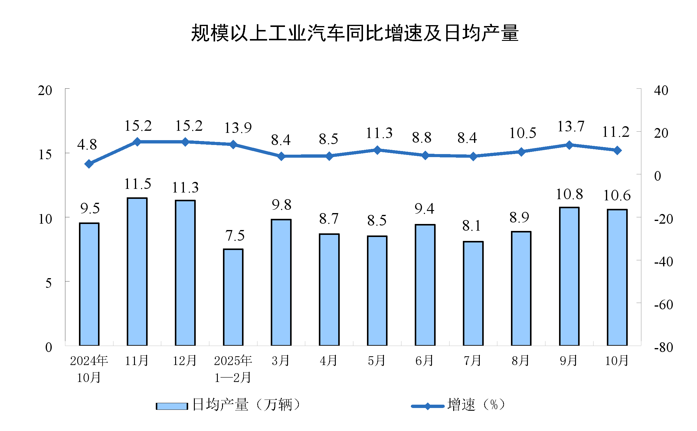 分产品看,10月份,规模以上工业623种产品中有313种产品产量同比增长。其中,钢材11864万吨,同比下降0.9%;水泥14775万吨,下降15.8%;十种有色金属695万吨,增长2.9%;乙烯314万吨,增长11.7%;汽车327.9万辆,增长11.2%,其中新能源汽车171.0万辆,增长19.3%;发电量8002亿千瓦时,增长7.9%;原油加工量6343万吨,增长6.4%。